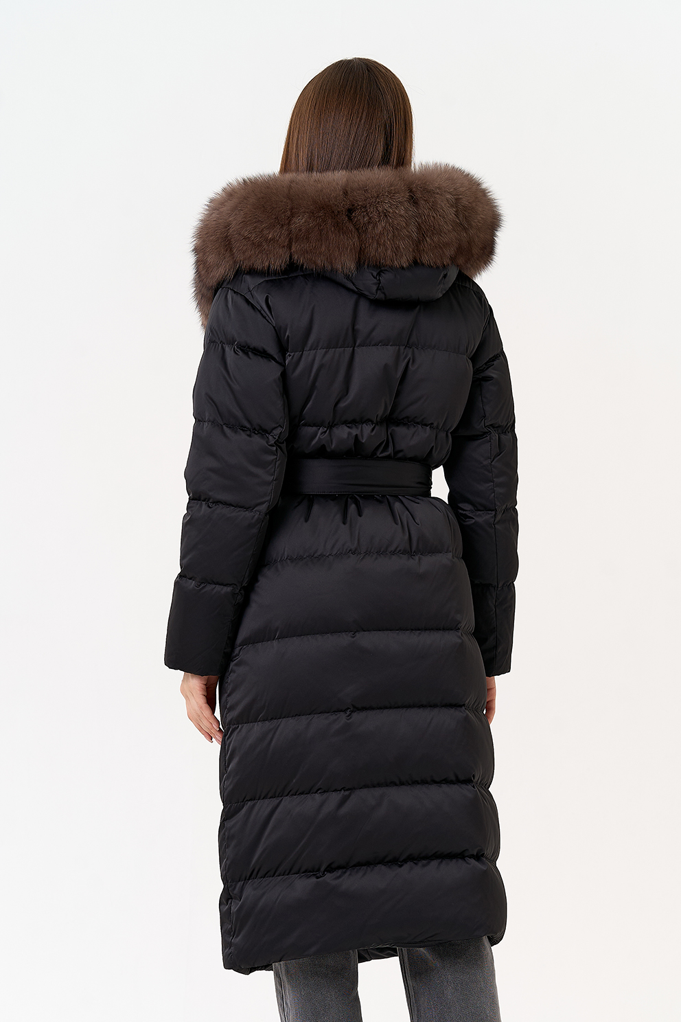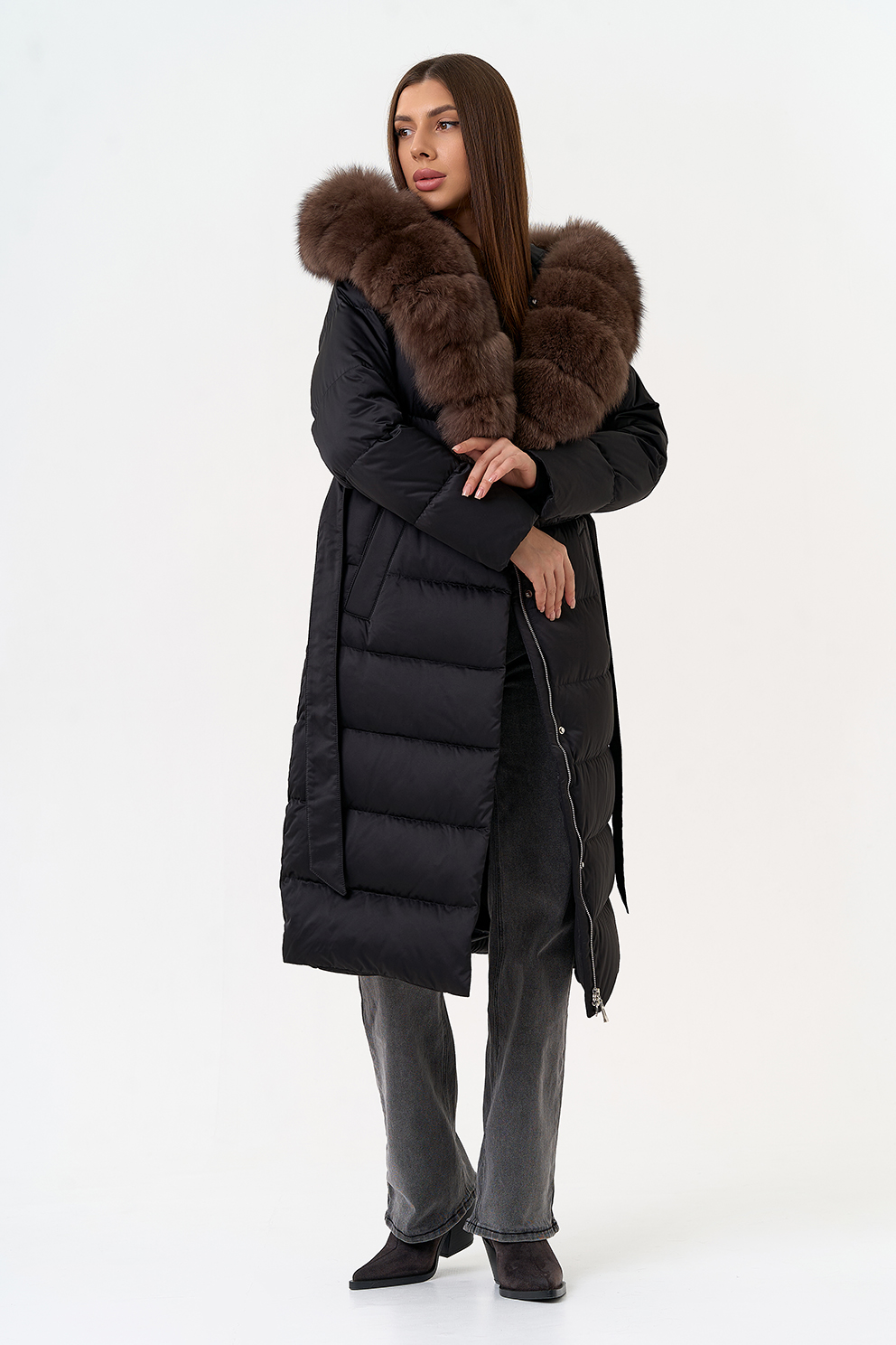 Крой воротника - капюшон, отделка мех песца