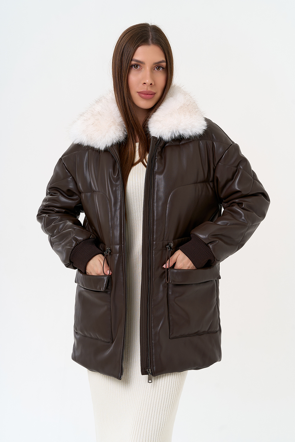 Отделка воротника - съемный эко мех, цвет белый